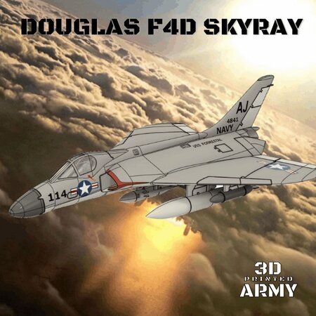DOUGLAS F4D SKYRAY . It was in service for a relatively short time (1956–1964) and never entered combat but it was the first carrier-launched aircraft to hold the world's absolute speed record at 1211.744 km/h and the first US Navy and US Marines corps fight that could exceed MACH 1 in level flight It's very original and beautiful with his delta wing and equiped with external fuel tank , missiles and rocket pod a small PDF guide is provided to help you to print your model and to assemblr it correctly Take a look to my new Facebook page her : https://www.facebook.com/3DPrintedARMY like it and follow me for lot of new models and my Pinterest page here https://www.pinterest.fr/3DprintedARMY/_created/