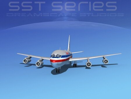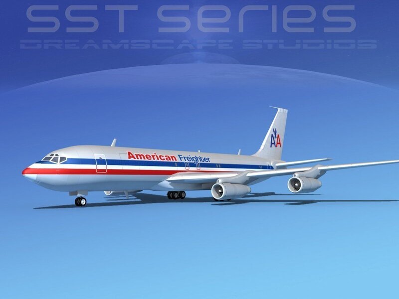 This Boeing 707-320 is built near to scale within a few percent of actual general dimensions. This medium poly model includes smooth exterior with some detail and a realistic rendering appearance. It is built with single sheet textures with a 2000x 2000 resolution. It also has landing gear that can be “turned off or hidden” for inflight animation. This model doe not have the animateable control surfaces of our non-sst model. This is the first model Dreamscape has produced with both single sheet textures and a full complement of liveries giving the user a wide variety of models to choose from.