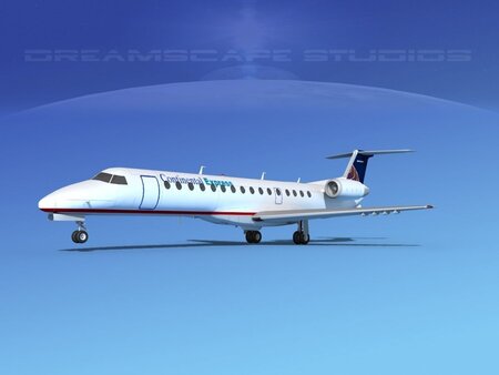 Embraer ERJ-140 Continental Express Accurate 3d model created near to scale (within 5%) according to the real reference. Native format is 3ds Max version 13. Model was exported to a wide variety of formats. Other formats are exported in one resolution. This can be further subdivided. Exported formats (3ds, lwo and obj) are prepared well to work correctly with every standard modeling software. Compatibility level with other software’s may be limited. This model has retractable landing gear, animateable ailerons, flaps, elevators, rudder, and turbines. Textures are included with all files. Previews were rendered using 3dsmax standard scanline. Model unit is variable depending on the model and references. The Embraer ERJ 140 family is a series of regional jets.