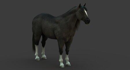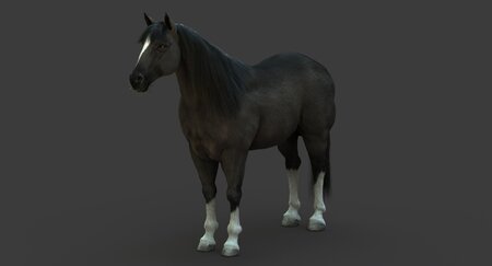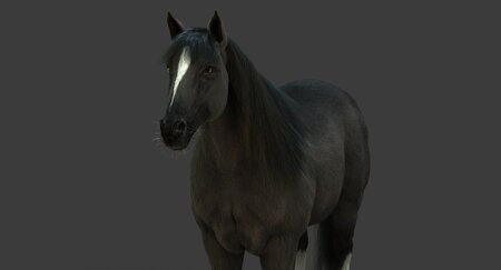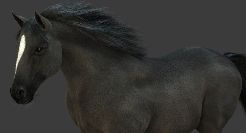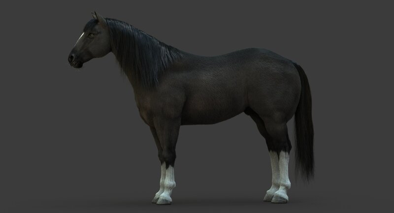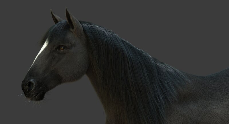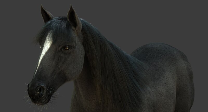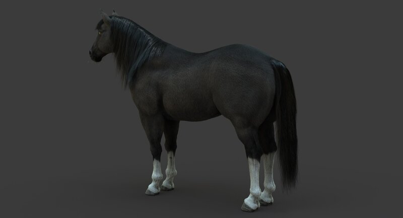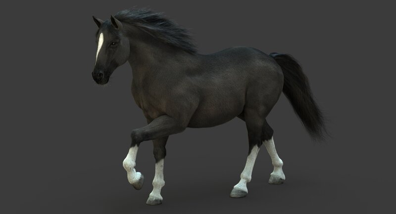 High Detailed Photorealistic Horse (Black color); FULLY RIGGED AND ANIMATED, UVunwrapped and smoothable, made with Maya. Shave and a haircut for hair.