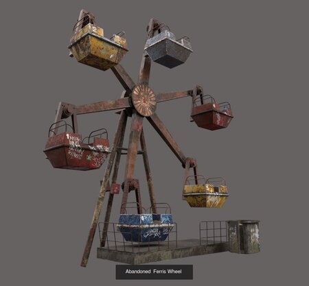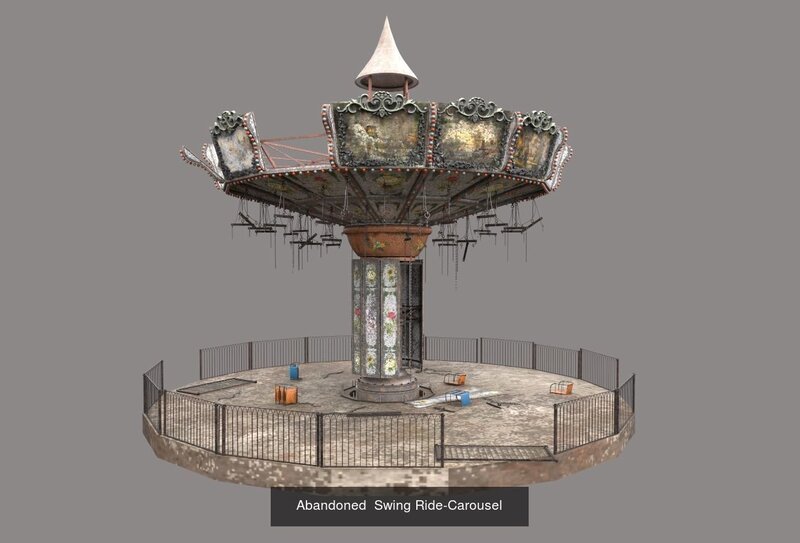Set of Carousels In Abandoned Amusement Park . Models are very realistic. All models has PBR material. All maps are diffuse-specular-glossiness-height and normal. All model's textures has two sizes; 4096x4096 - 2048x2048 and maps are PNG formats .