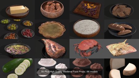 50 + High Quality Medieval Food Props - 68 3D Models- Files Include FBX and OBJ. Includes PBR Texture in 4096 x 4096. - Maps include : Basecolor, Normal, Roughness, Height and Metallic. Some models include AO, SSS, Opacity and Emmisive maps. All Preview renders were done Marmoset Toolbag 4 Scaled to real world scale.