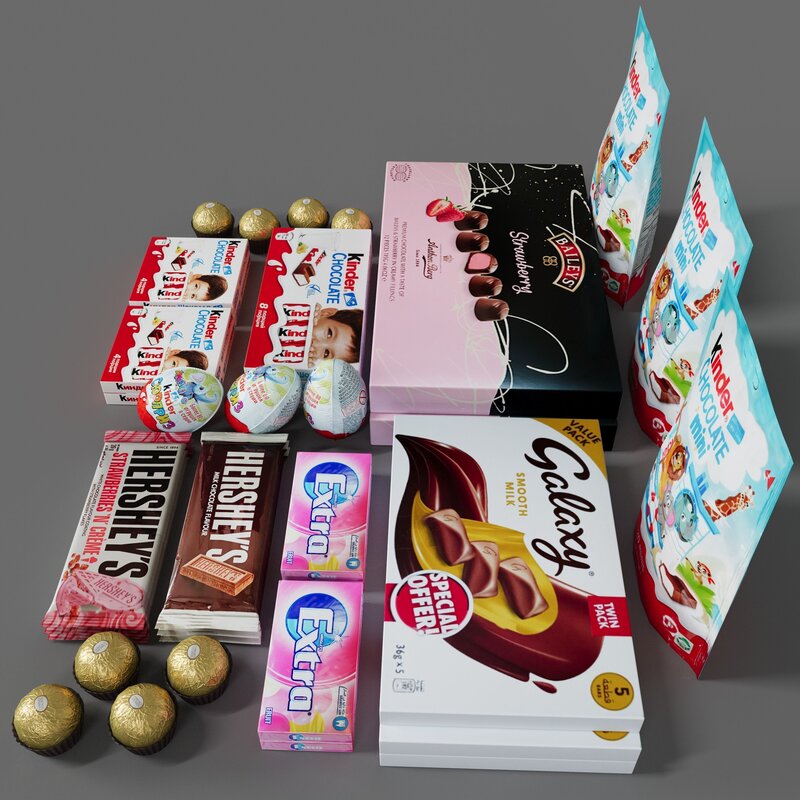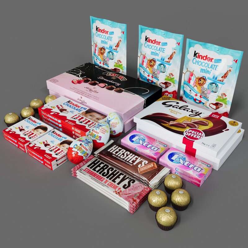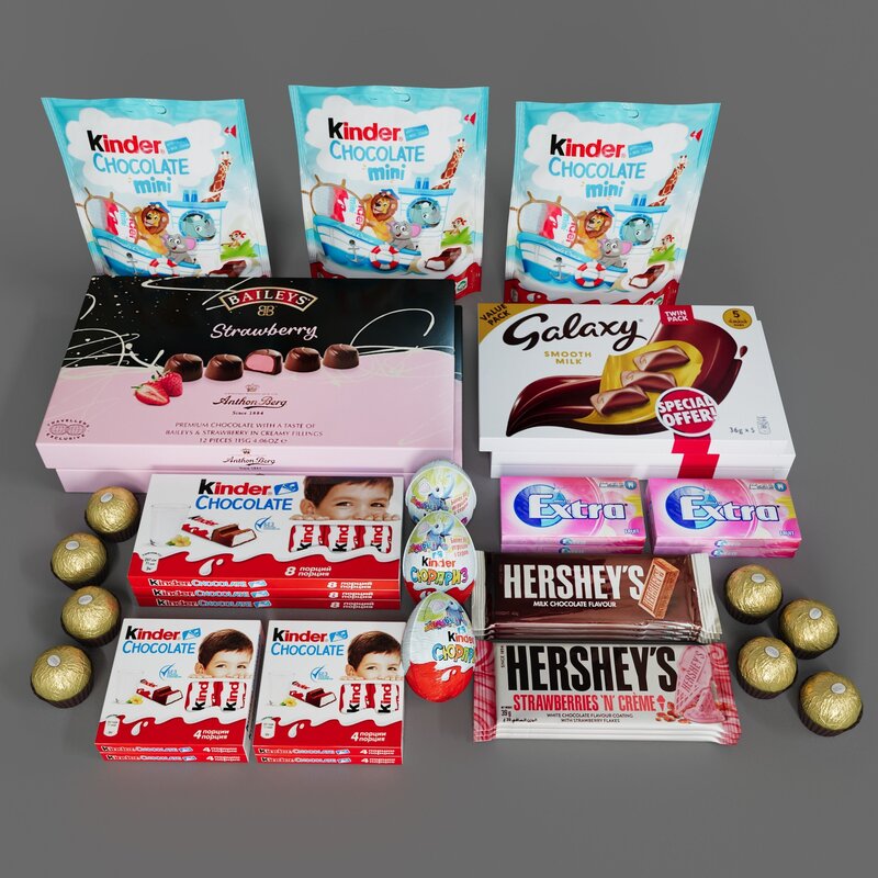 This sweet set includes: Baileys' chocolate Kinder Chocolate Mini Kinder Egg Kinder Chocolate Wrigley's Extra Galaxy Chocolate Ferrero Rosher
