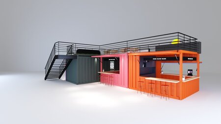 Concept of fast food container restaurant. Furniture set, stairs on top, potted plants, cash machine, various decorative elements.