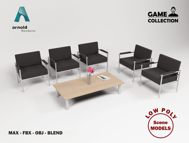 3D Models of waiting room furniture . The models has been created with 3D Studio Max 2022 and Blender 2.93. All the models are low poly, basic but realistic and are ideal for 3D scenes that require few polygons. They can be used for advertising visualitations and also for games or applications. It has been created in different 3D Studio Max versions and also in FBX, OBJ and blend.