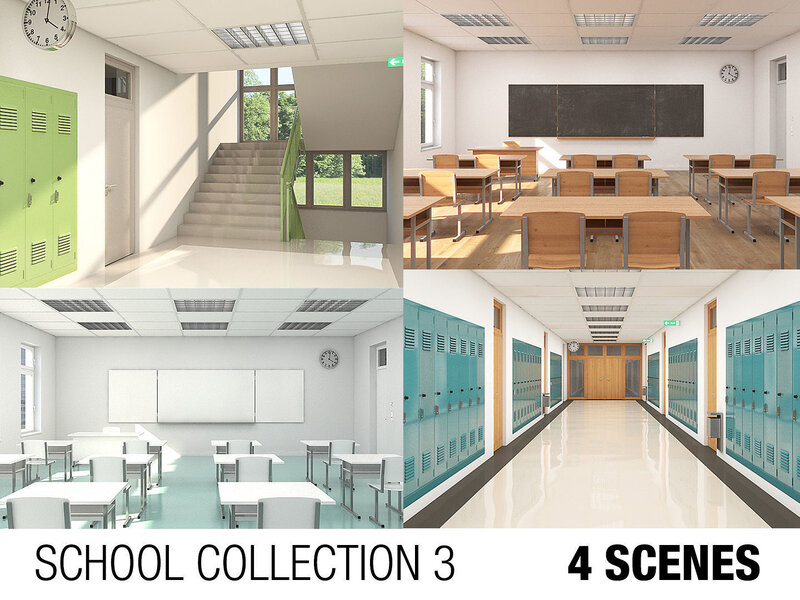 A COLLECTION OF FOUR INDIVIDUAL SCHOOL SCENES - CLASSROOM INTERIOR x 2, HALLWAY x 2: